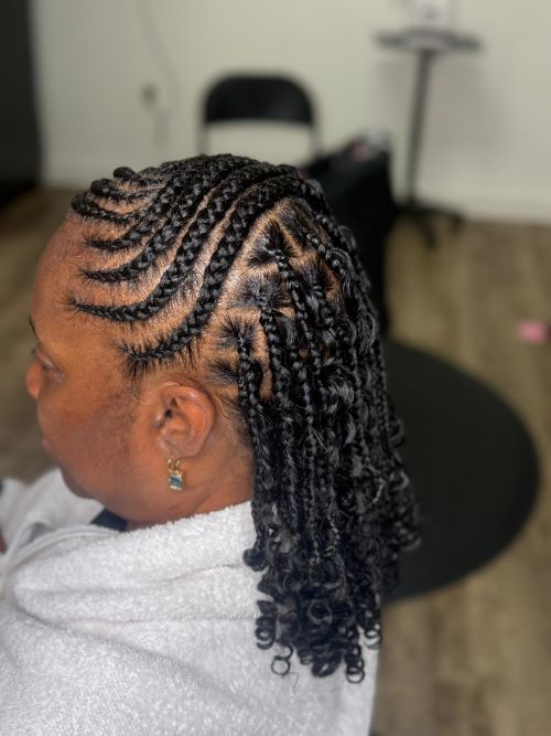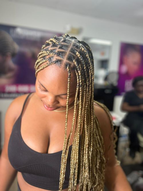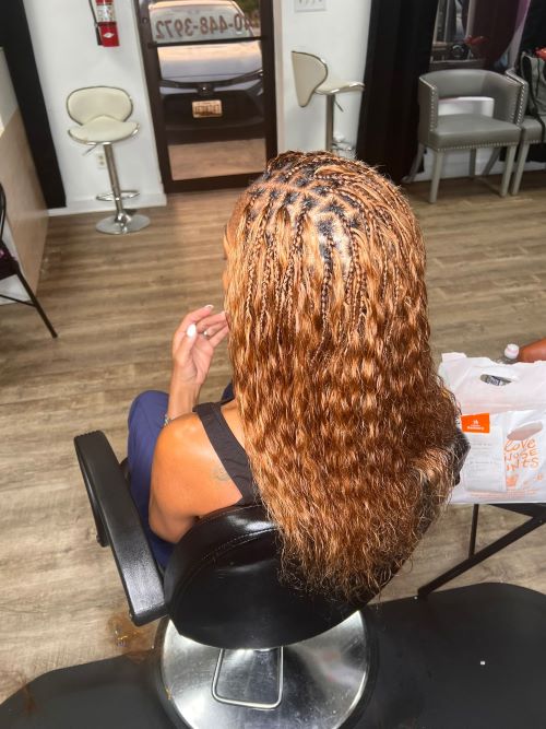 Hair braiding styles in Waldorf MD are beautifully showcased in our gallery, highlighting knotless braids, bohemian styles, cornrows, crochet braids, and natural hair transformations by Golden Comb Empire by Lynda.